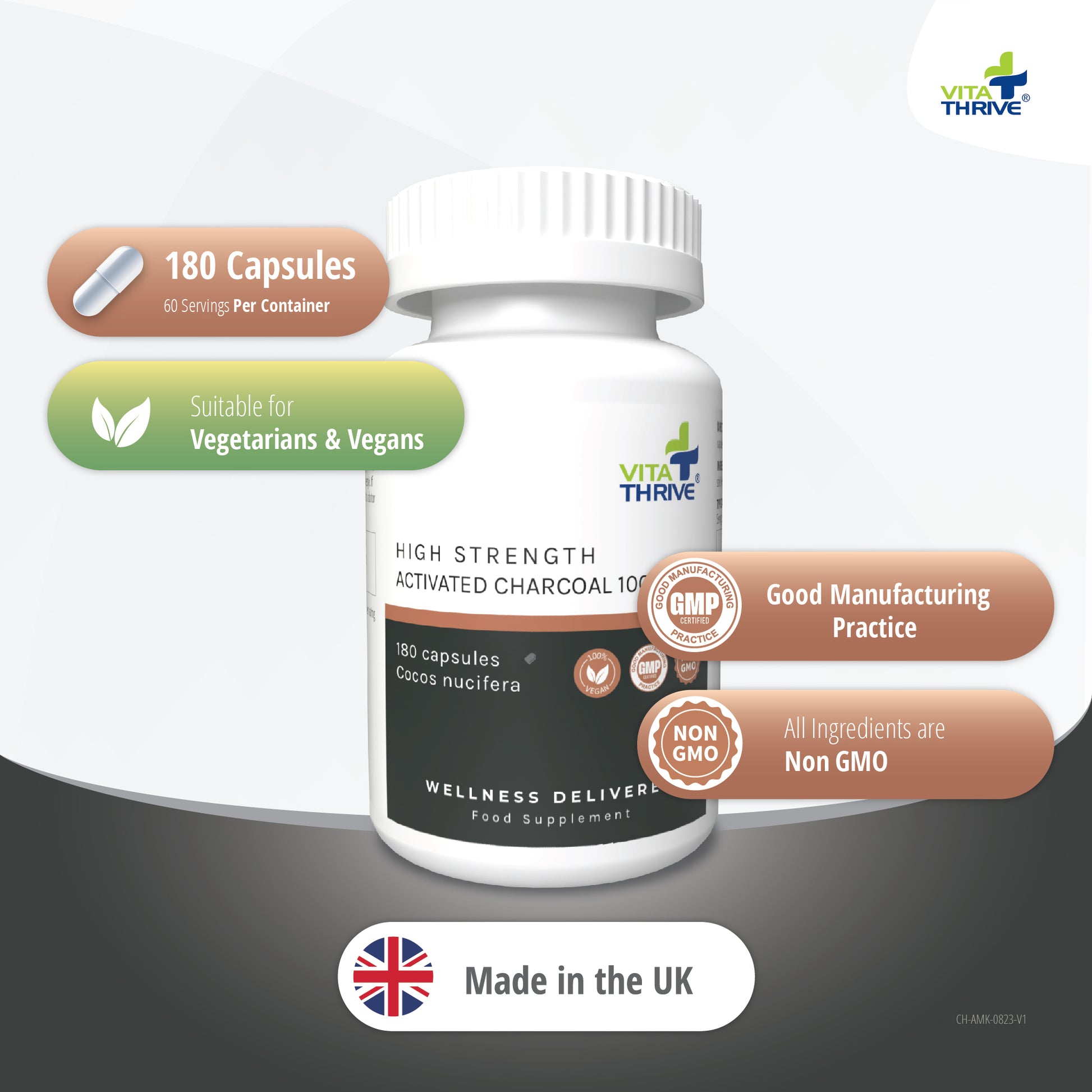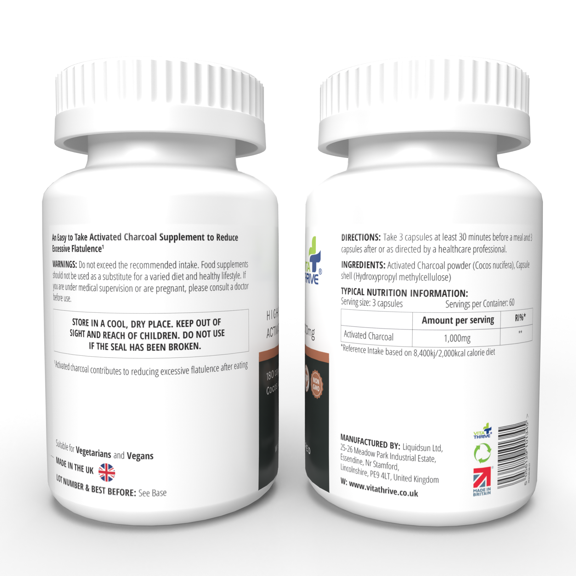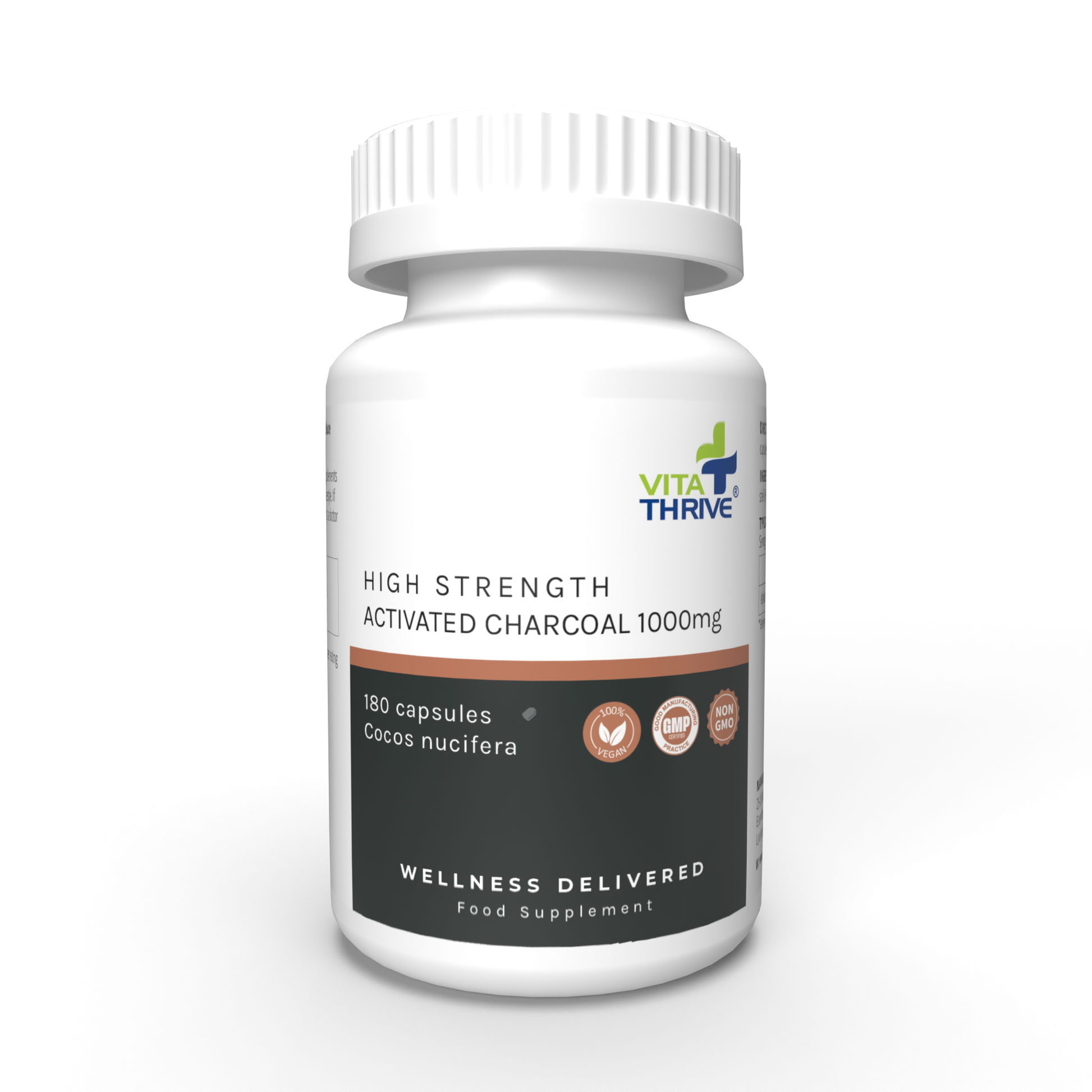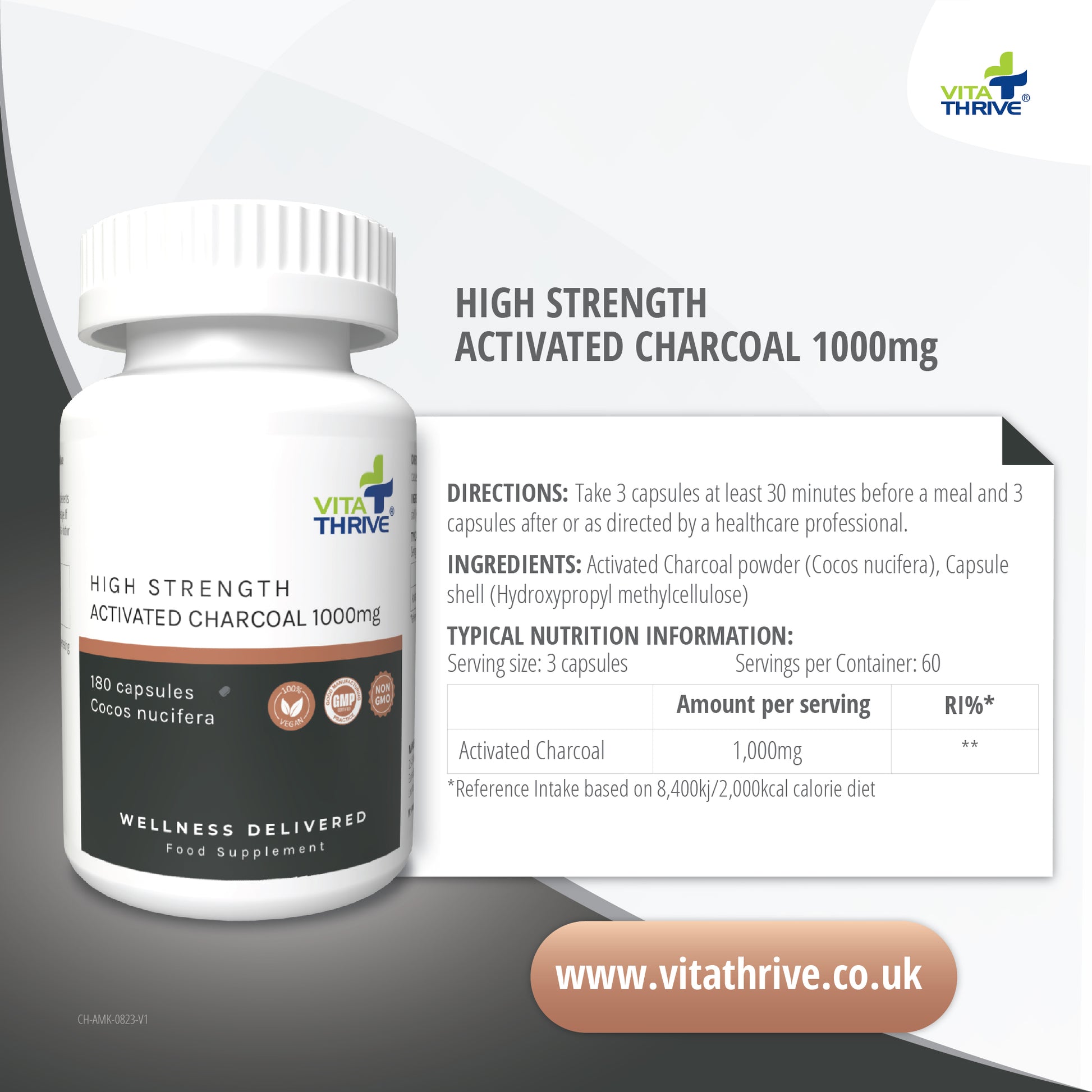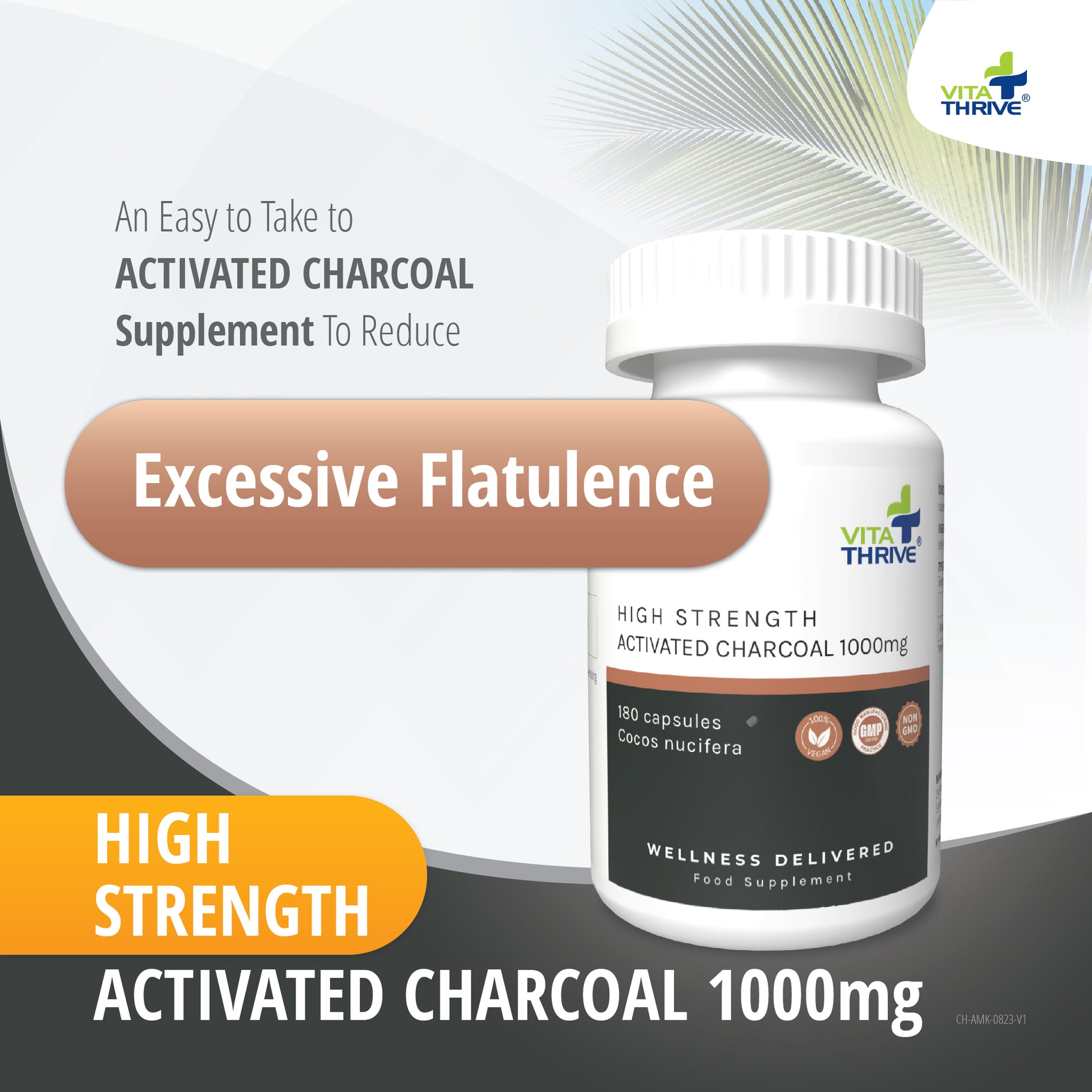 - Vitathrive offers a high dose strength of 1000mg Activated Charcoal to tackle indigestion, bloating and excessive flatulence.