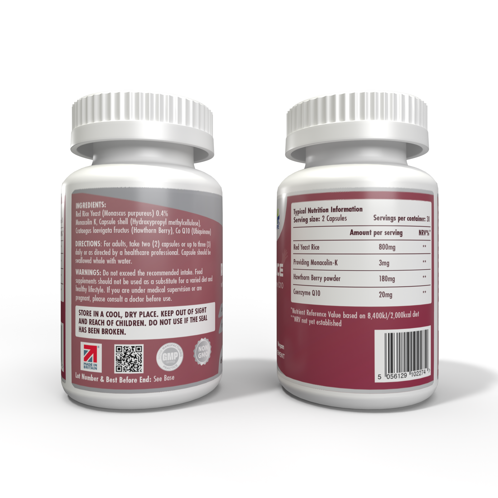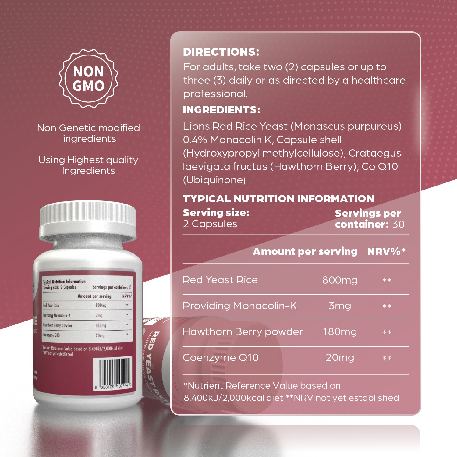 Monascus purpureus (Red Rice Yeast) 0.4% Monacolin-K, Capsule shell (Hydroxypropyl methylcellulose), Crataegus laevigata fructus (Hawthorn Berry), Co Q10 (Ubiquinone).