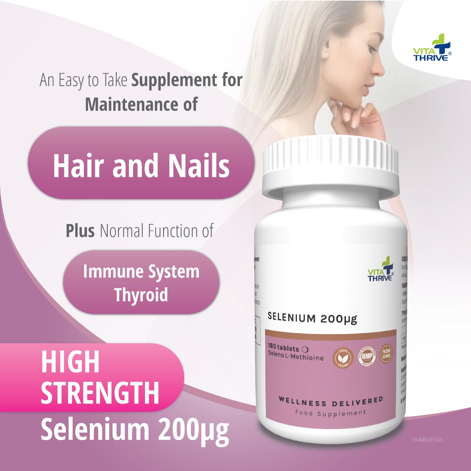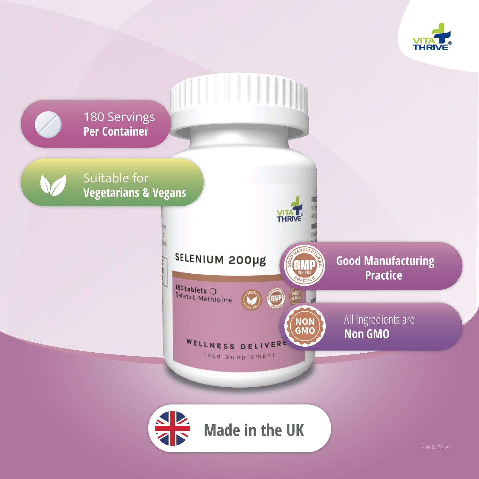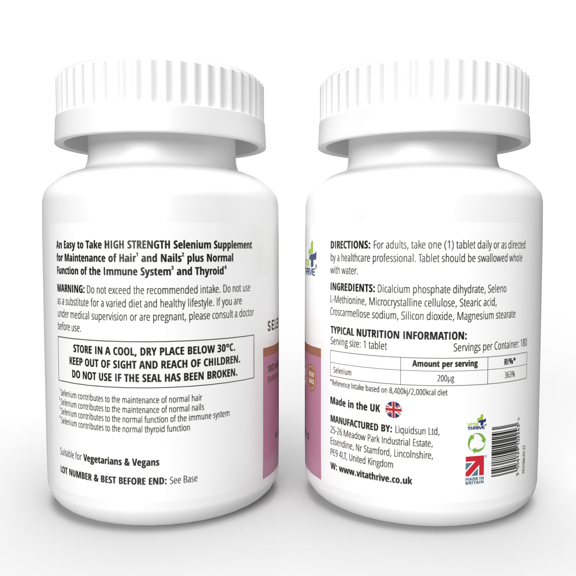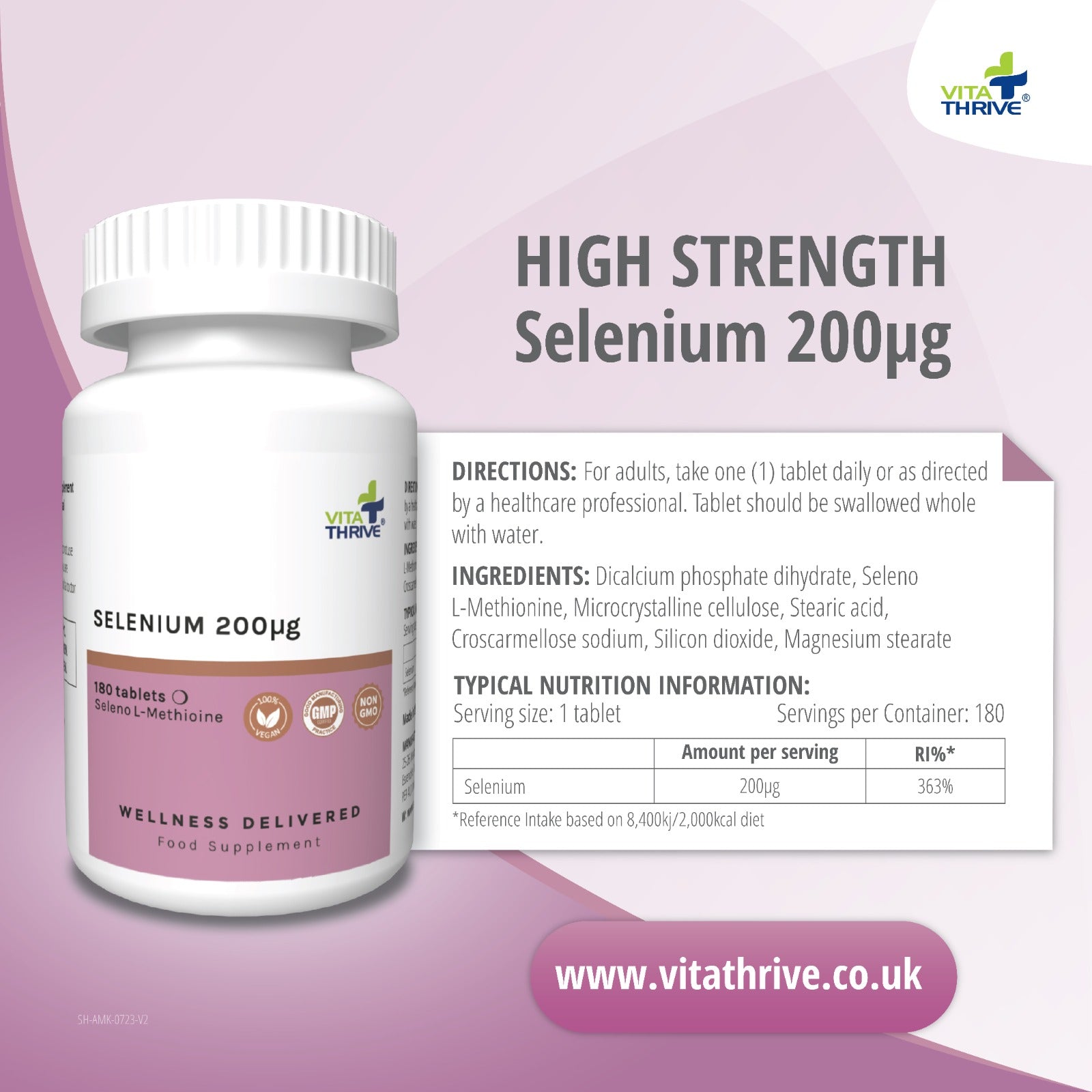 - VitaThrive’s Selenium tablets provides 6 months’ supply of 200mcg (363% reference intake) in a small easy to swallow tablet.