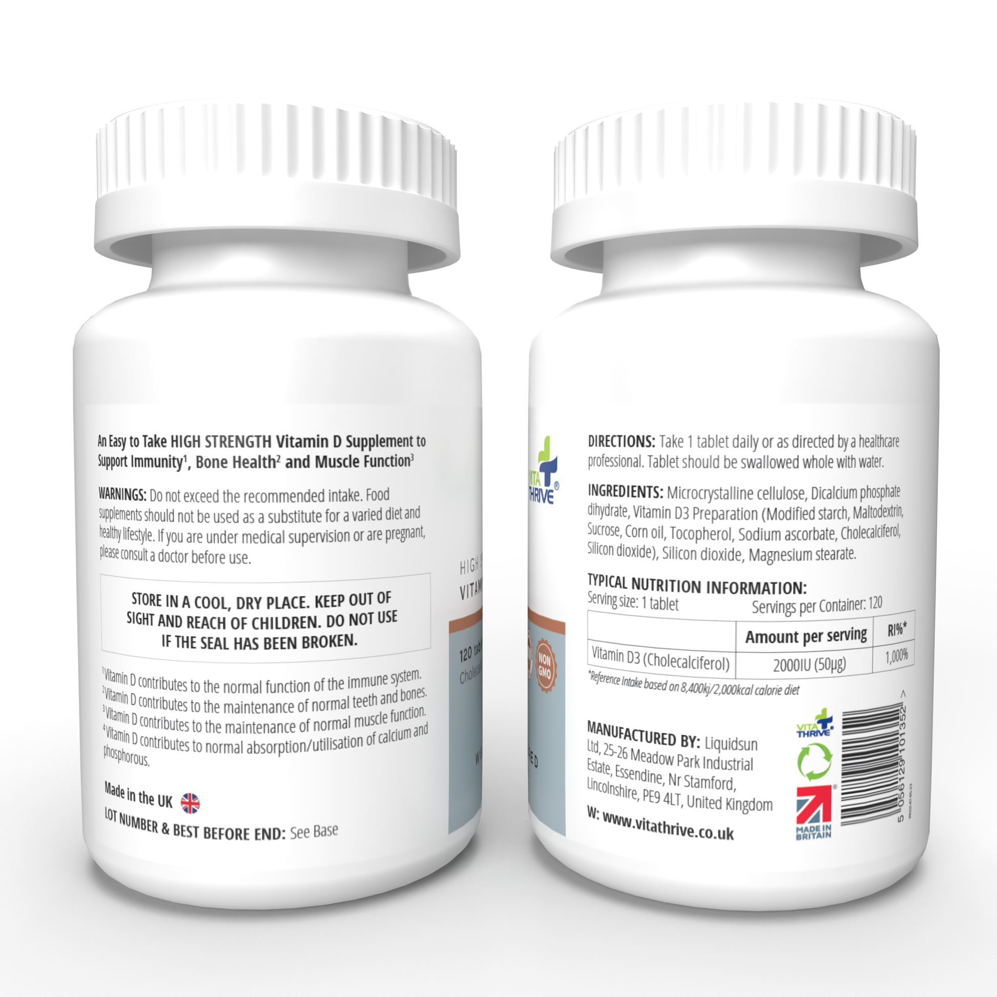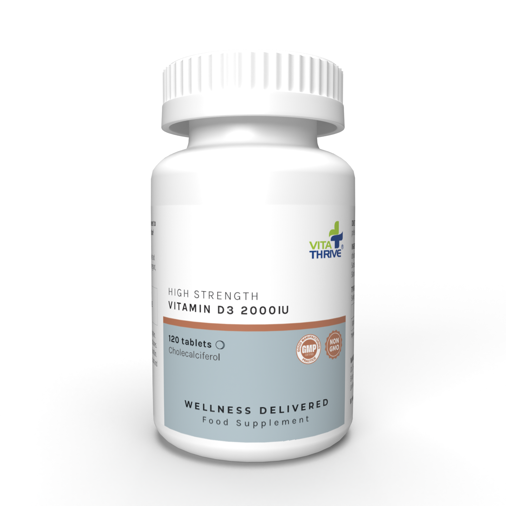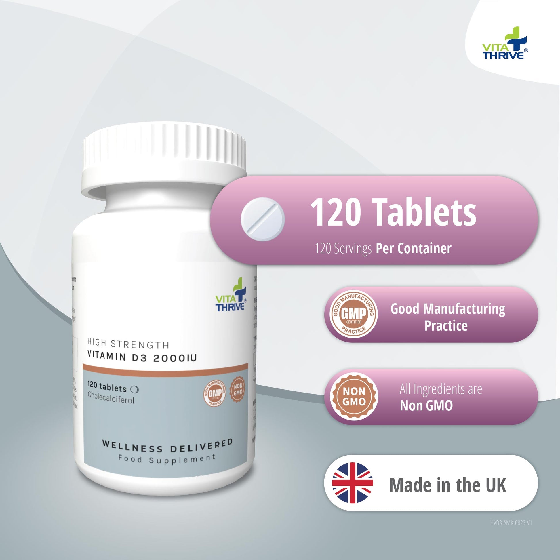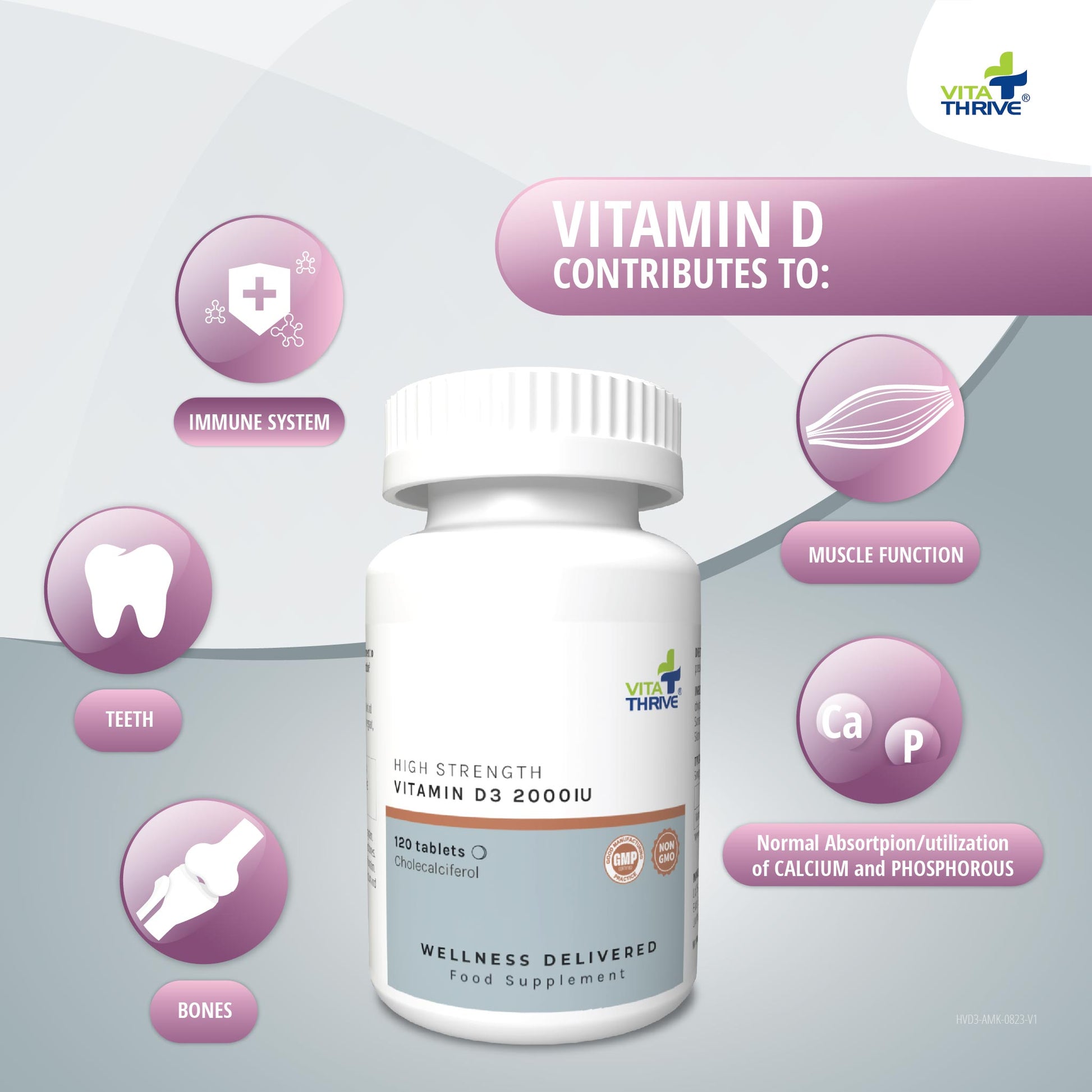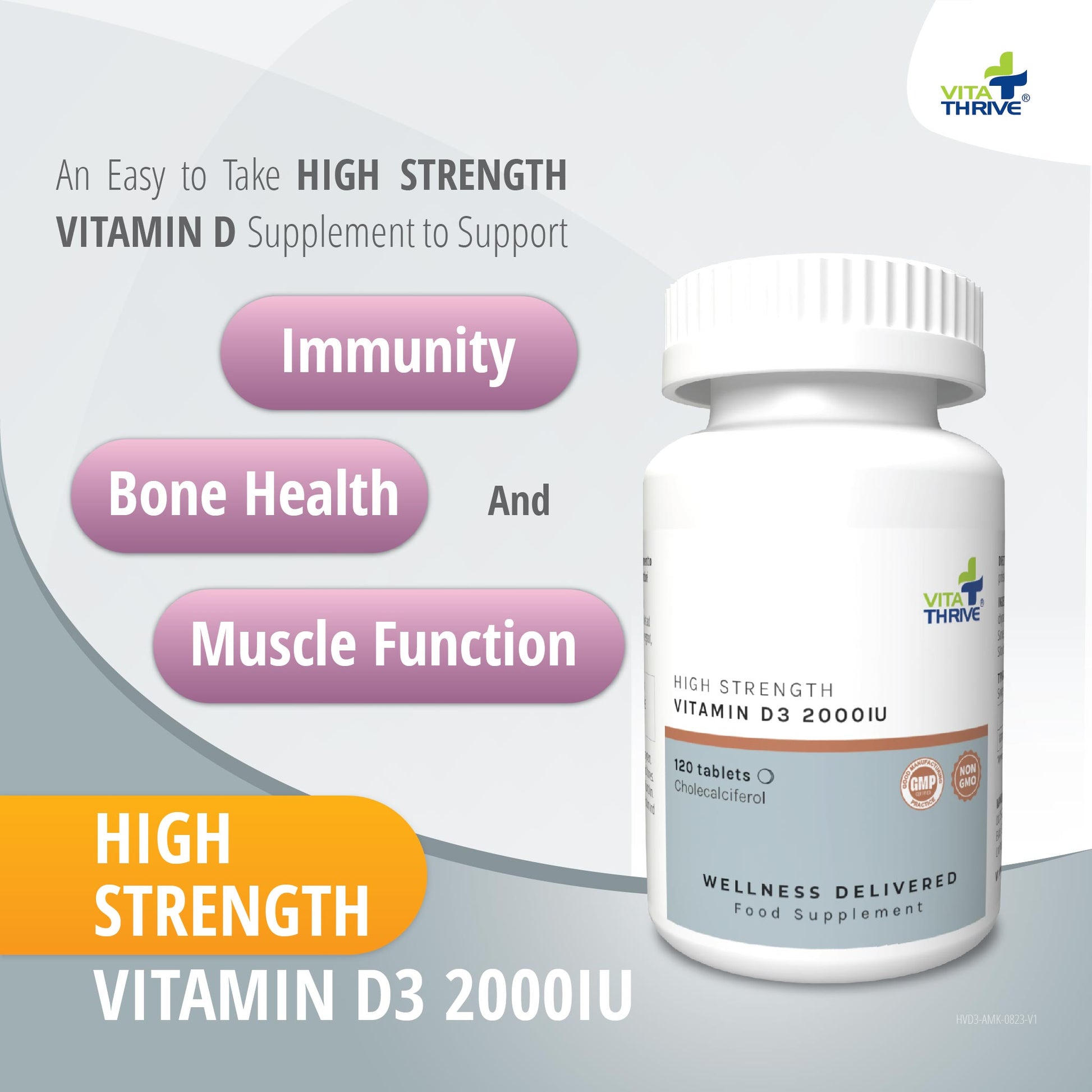 - VitaThrive Vitamin D3 tablet provides a high strength of 2000 IU (1000% Nutrient Reference Value) in a small easy to swallow tablet.